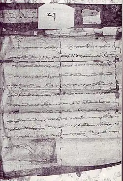 The Tibetan kings were said to remain connected to the heavens via a dmu cord (dmu thag) so that rather than dying, they ascended directly to heaven, when their sons achieved their majority.[20] According to various accounts, king Drigum Tsenpo (Dri-gum-brtsan-po) either challenged his clan heads to a fight,[21] or provoked his groom Longam (Lo-ngam) into a duel. During the fight the king's dmu cord was cut, and he was killed. Thereafter Drigum Tsenpo and subsequent kings left corpses and the Bön conducted funerary rites.[15][22][23]