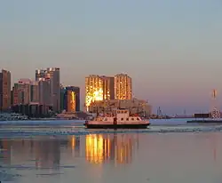 In 1967, the Harbour Commission initiated a study into converting the airport into one suitable for the passenger jets of the day, such as DC-8s. The island airport runways would be too short for jets, so a new airport would have to be built on new land reclaimed from Lake Ontario.[55] The Commission developed this further into a full redevelopment of the Islands, whereby a residential development, entitled Harbor City would be built on the existing island airport lands, and a new airport with a runway long enough for jets would be built on a peninsula parallel to the south shore of the Toronto island. The sale of the residential units would provide the funds to develop the islands as a whole. This plan, unveiled in 1968, was developed in conjunction with Metropolitan Toronto's Planning Board. This plan also outlined the development of a new harbour, the Outer Harbour east of the Eastern Gap.[56] The plan was later modified to situate the new Island Airport on the Outer Harbour headland, east of the Islands, with road access available from the Gardiner Expressway south along Leslie Street.[57] Although the plan was approved by Metropolitan Toronto and the Government of Ontario, the Government of Canada ruled out the waterfront site for a major airport early in 1970, although Transport Minister Donald Jamieson suggested there would be some sort of expanded airport serving "short-hop, inter-city" flights created.[58] Of the complete project, only the Outer Harbour and its headland was constructed. The Outer Harbour is currently the site of a marina and a bird sanctuary.