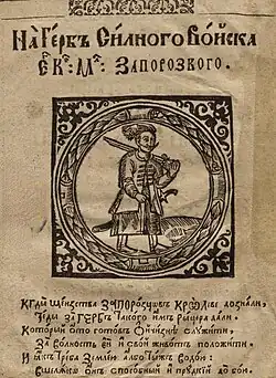 Orthodox brotherhoods presented another important centre of literary activity in early 17th-century Ukraine. In Kyiv and Lutsk their members organized own schools, which provided education in Greek, Latin and Church Slavonic.[27] A prominent author from Kyiv during that period was Kasian Sakovych, rector of the Kyiv Brotherhood School (future Kyiv-Mohyla Academy), known for his panegyric poem written for the burial of hetman Sahaidachny.[28] The renewal of Orthodox hierarchy by Polish authorities in 1621-1622 contributed to a new literary discussion.[29] This period in Ukrainian literature saw the emergence of the idea of Ukrainian Cossacks being a continuation of the old Rus state centered around Kyiv.[30] Cultural orientation of Ukrainian authors during that time can be seen as an intermediary position between the Polish-Latin West and Oriental Muscovy.[31]