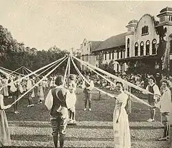 One of the most colorful and anticipated events was the annual May Day celebration. The first May Day occurred in the Spring of 1913. Every student took part in the event, and visitors came to the campus to be entertained by the festivities. The first celebrations were held on the front lawn of Converse Hall and were later moved to the outdoor theater at Drexel Park. The events of May Day were often based on the Old English May Day ceremonies that celebrated Spring, but it was common for each year to have a theme. The event had a carnival-like atmosphere with student dressed in elaborate costumes performing skits and dances and the winding of the brightly colored May pole. Each festival had a May Queen, selected from the senior class to preside over the events, and a May Court.