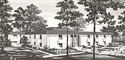 The first building on the campus, constructed between 1912 and 1913, was named in honor of William Lorraine Converse Sr. who, as a State Representative, helped expedite the establishment of the college in Valdosta. On December 19, 1912, Dr. Powell moved into office his in the new building and the first pieces of furniture were installed in preparation if the school's opening.[2] Converse Hall served a variety of purposes for the new institution. The structure provided classrooms, administration offices, double-occupancy dormitory rooms, a dining hall, an infirmary, and a chapel. The Spanish Colonial Revival architecture of college in Valdosta was based on the popular style of the era, as well as Powell's personal experiences in the American Southwest. The school opened in January 1913, but the surrounding landscape was primarily undeveloped There were no driveways or sidewalks, and the predominant wetlands at the south were only crossable at Patterson Street.