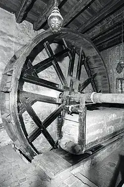At the hemp house, the hemp fiber would arrive in large square bales, already macerated and dry, and it would be forcefully slammed against a wooden pole, equipped with metal rods, to complete the breakage of the stalk.[52] The remaining woody fragments would then be removed using comb-like tools of different shapes for both coarser and finer combing, in preparation for the spinning phase.[52][53] While using scutching tools with ever-finer teeth, the finest of which could have a teeth spacing as small as 1 mm (0.04 in), the artisans would gradually separate the different fibers based on their qualities, including their robustness and color.[54] The spinning mechanism consisted in a large rotating wooden wheel, placed vertically and firmly fixed to the ground, equipped with laterally protruding rods that supported a winding rope connecting the wheel to several interchangeable wooden cylinders of different dimensions, depending on the final size of the rope to be produced, which were located a few meters away.[52][53] The rotating wheel would make such cylinders spin, and they could be used to either twist a twine (with a single cylinder), or intertwine three or four strings (with multiple cylinders) to produce different types of rope.[52][53][54]