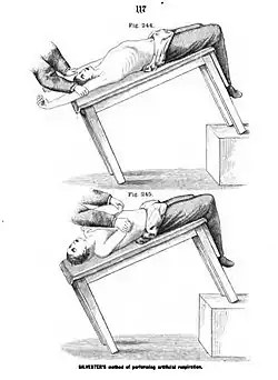 In 1856, English physician Marshall Hall (1790–1857) described a new method of providing artificial ventilation of the lungs, which involved rolling the victim from the prone (inspiratory) to the lateral (expiratory) position at a rate of sixteen times per minute.[3] Henry Robert Silvester (1828–1908) soon noted several important shortcomings inherent in Hall's technique. Chief among these were 1) that the resulting inspiratory and expiratory volumes were quite small, 2) that repeatedly rolling a lifeless body from prone to lateral was likely to cause significant injury to the cervical spine and face, and finally 3) that the risk of pulmonary aspiration of gastric contents was unacceptably high using Hall's method.[21]