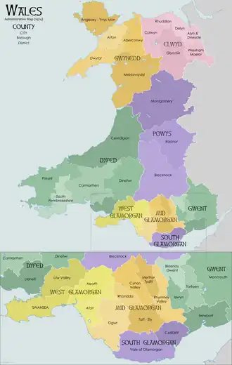 - Mid Glamorgan — Cynon Valley, Ogwr, Merthyr Tydfil, Rhondda, Rhymney Valley, Taff–Ely