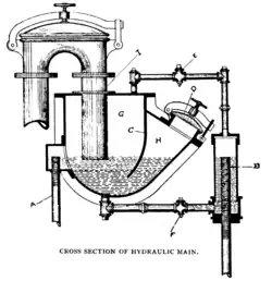 Within each retort-house, the retort benches would be lined up next to one another in a long row. Each retort had a loading and unloading door. Affixed to each door was an ascension pipe, to carry off the gas as it was evolved from the coal within. These pipes would rise to the top of the bench where they would terminate in an inverted "U" with the leg of the "U" disappearing into a long, trough-shaped structure (with a covered top) made of cast iron called a hydraulic main that was placed atop the row of benches near their front edge. It ran continuously along the row of benches within the retort house, and each ascension pipe from each retort descended into it.