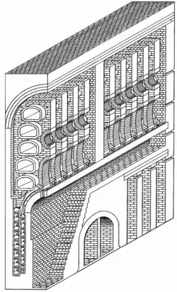 - The introduction of heat recuperation for the preheating of the air of primary and secondary combustion. By causing the exhaust of the retort-bench to pass through a maze of refractory brickwork, substantial quantities of heat can be extracted from it. On the other side of the exhaust channels are channels for the passage of the air of combustion. The bricks thus transfer the heat of the exhaust to the air of combustion, preheating it. This provides for a much greater degree of thermal efficiency in the retort-bench, causing it to be able to use far less coke, since air that is preheated by waste heat is already hot when it enters the fire to be burnt, or the "tuyere" to fuel secondary combustion.