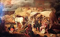 This increase in size came not just in the number of actual soldiers but also camp followers, or tross, — anywhere from half to one and a half times the size of the army itself — and the size of the baggage train — averaging one wagon for every fifteen men.[46] However, little state support was provided to these massive armies, the vast majority of which consisted of mercenaries. Beyond being paid for their service by the state (an act which bankrupted even the Spanish Empire on several occasions), these soldiers and their commanders were forced to provide everything for themselves. If permanently assigned to a town or city with a working marketplace, or travelling along a well-established military route, supplies could be bought locally with intendants overseeing the exchanges. In other cases an army travelling in friendly territory could expect to be followed by sutlers, whose stocks were small and subject to price gouging, or a commissioner could be sent ahead to a town to make arrangements, including billetting if necessary.[48]