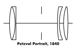 A 150mm Petzval lens was fitted to a conical metal Voigtländer camera taking circular daguerreotypes in 1841. The Voigtländer-Petzval was the first camera and lens specifically designed to take photographs, instead of being simply a modified artist's camera obscura.[1]: 37 [7][8] The Petzval Portrait was the dominant portrait lens for nearly a century. It had what would now be considered severe field curvature and astigmatism, but It was centrally sharp (about a 20° field of view, or 10° for critical applications), and it quickly drifted out of focus to a soft outer field, producing a pleasant halo effect around the subject. The Petzval Portrait remains popular as a projection lens where the narrow angles involved mean the field curvature is not significant.[9]: 823–824