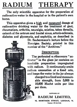 Radium emanation activators, apparatuses that would apply radium emanation to water, started being produced and marketed. Scientifically constructed emanators were sold to hospitals, universities, and independent researchers. Certain companies advertised that they would only give them out to others on a medical prescription[4] and would guarantee the strength of radium in each dose.