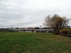 In April 1966, the MBTA started paying subsidies to the NYNH&H for continued operations on four lines, including the Dedham Branch.[20][5][g] Despite this, Dedham Branch service was discontinued in April 1967, a victim of poor ridership.[20][5] A pedestrian bridge over the tracks was constructed in 1967 when Dedham High School was expanded and new athletic facilities were built on the other side of the tracks.[21]