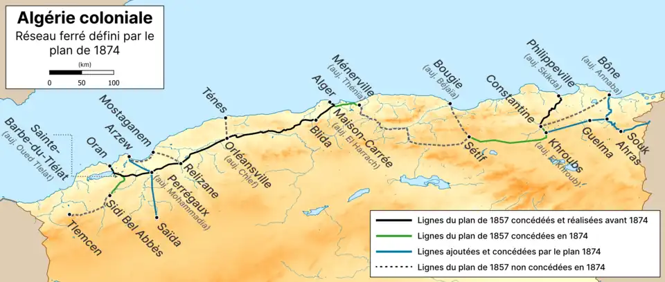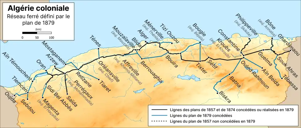 It was only in 1857 that Marshal Vaillant, the Minister of War at the time, presented Emperor Napoleon III with a comprehensive plan for the construction of Algerian railways.[6] The main axes of this plan are as follows:[9]