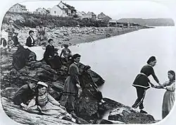 In the 19th century, the woman's double suit was common, comprising a gown from shoulder to knees plus a set of trousers with leggings going down to the ankles. In the first half of the 19th century, the top became knee-length, while an ankle-length drawer was added as a bottom. By the second half of the 19th century, in France, the sleeves started to vanish, the bottom became shorter to reach only the knees and the top became hip-length and both became more form fitting.[2][5] In the 1900s, women wore wool dresses on the beach that were made of up to 9 yards (8.2 m) of fabric.[7]