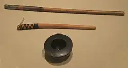 Ancient tattooing was widely practiced among the Austronesian people. The distinctive Austronesian tattooing tools involving the perpendicular hafting of points and the use of a mallet (commonly known as hand-tapping) were already in use by Pre-Austronesians in Taiwan and coastal South China prior to at least 1500 BCE, before the Austronesian expansion into the islands of the Indo-Pacific.[11][12][13] It may have originally been associated with headhunting.[14] Tattooing traditions, including facial tattooing, can be found among all Austronesian subgroups, including Taiwanese Aborigines, Islander Southeast Asians, Micronesians, Polynesians, and the Malagasy people. For the most part Austronesians used characteristic perpendicularly hafted tattooing points that were tapped on the handle with a length of wood (called the "mallet") to drive the tattooing points into the skin. The handle and mallet were generally made of wood while the points, either single, grouped or arranged to form a comb were made of Citrus thorns, fish bone, bone, teeth and turtle and oyster shells.[11][15][13][16]