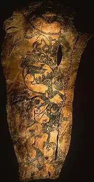 Tattooing has been practiced across the globe since at least Neolithic times, as evidenced by mummified preserved skin, ancient art and the archaeological record.[1][2] Both ancient art and archaeological finds of possible tattoo tools suggest tattooing was practiced by the Upper Paleolithic period in Europe. However, direct evidence for tattooing on mummified human skin extends only to the 4th millennium BCE. The oldest discovery of tattooed human skin to date is found on the body of Ötzi the Iceman, dating to between 3370 and 3100 BCE.[3] Other tattooed mummies have been recovered from at least 49 archaeological sites, including locations in Greenland, Alaska, Siberia, Mongolia, western China, Japan, Egypt, Sudan, the Philippines and the Andes.[4][5][6] These include Amunet, Priestess of the Goddess Hathor from ancient Egypt (c. 2134–1991 BCE), multiple mummies from Siberia including the Pazyryk culture of Russia and from several cultures throughout Pre-Columbian South America.[3]