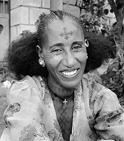 16th century Ottoman scholars described the tattoo as very common among the Arabs.[78] Facial and hand[79] tattoos among Bedouins have long been documented and continue until the present, especially among women. The tattoos are usually done at home by other women (Romani women were traditionally hired for this work),[80] and symbolize personal milestones and community history and identification. The tattoos are often made by indentation and insertion of indigo dye on the face, ankles, wrists and other body parts. They are also considered to ward of the evil eye and forces, and protect the person, with some attributing healing and medical properties, similar to Ancient Egypt.[81][79] Designs may include stars, animals, or geometric designs.[79] Tattooing has decreased in popularity since the 1950s.[80]