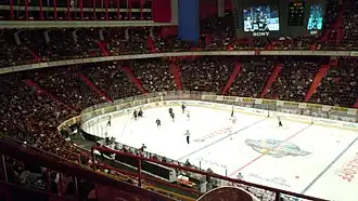 On June 27, 2014, the Ducks acquired center Ryan Kesler (as well as a third-round pick in 2015) from the Vancouver Canucks in exchange for Nick Bonino, Luca Sbisa and a first- and third-round pick in 2014.[32] In the following season, they won their third-straight Pacific Division title and finished as the top seed in the West with 109 points. In the 2015 playoffs, they swept the Winnipeg Jets in the first round. In Round 2, the Western Conference Semifinals, they extended a 19-game losing streak the Calgary Flames held at the Honda Center (presently at 22 games) by winning the first two games, but lost Game 3 in Calgary in overtime. They then rallied together to win their next two games to win the series four games to one and to set up a Western Conference Final against the Chicago Blackhawks. After taking a three games to two series lead on the strong play of goaltender Frederik Andersen, the Ducks lost the final two games, including Game 7 on home ice. This marked the third straight season the Ducks had lost a series in Game 7 at home after leading the series three games to two.[33] Andersen allowed four or more goals in each of the final four games of the series; the Ducks lost three of those four games and allowed 19 goals over that span.[34] The Ducks scored 3 goals in a span of 37 seconds in Game 4 of the series against the Blackhawks, the second fastest time in playoff history.[35]