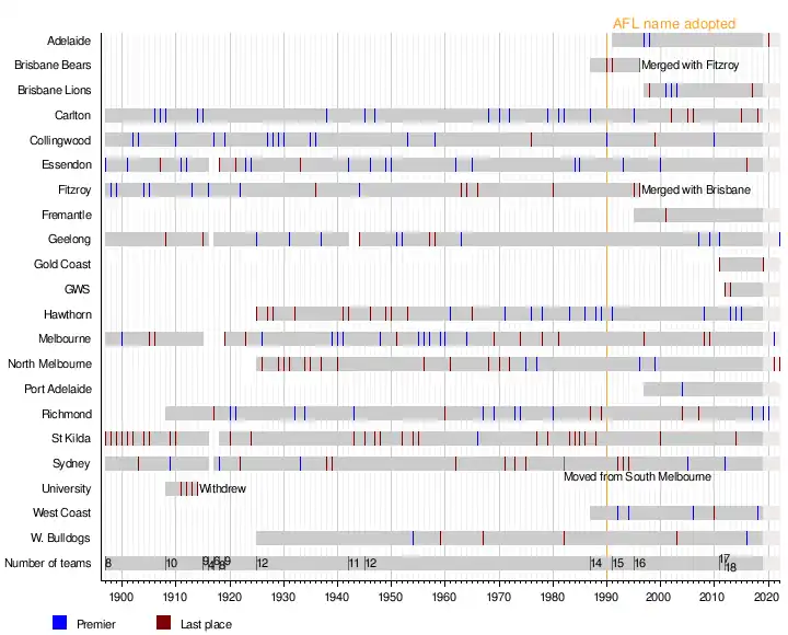 The Victorian Football League was established in 1896 when six of the strongest clubs in Victoria—Collingwood, Essendon, Fitzroy, Geelong, Melbourne, and South Melbourne—broke away from the established Victorian Football Association to establish the new league.[1] The six clubs invited two more VFA clubs—Carlton and St Kilda—to join the league for its inaugural season in 1897. Among the notable initiatives established in the new league was an annual finals tournament rather than awarding the premiership directly to the team with the best record in the season; additionally, the formal establishment of the modern scoring system was set in which six points are scored for a goal, and one point scored for a behind.