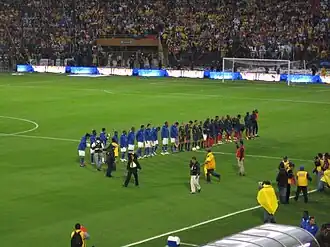 Despite the elimination, the national team was greeted by tens of thousands of Colombians in Bogotá, welcoming them back as heroes and restoring pride to the nation.[29] Colombia would then receive the FIFA Fair Play Trophy and have James Rodríguez and Juan Cuadrado end as the World Cup's leading goal scorer and assist leader, respectively.[30][31]