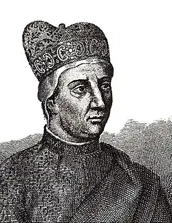 Among others, it can be assumed that Nicolò Semitecolo and Lorenzo Veneziano also took part in the decorative work.[63] During this decorative work, the frieze depicting the faces of the doges was created for the first time, starting with Obelerio, which was later reproduced after it was destroyed by fire in 1577. Sanudo states that the inscriptions illustrating the pictorial works were produced by Francesco Petrarca, which is not impossible.[63][66] Later, however, after a period of continuous wars (1368-1381), Venice found itself in difficult political and economic conditions, and therefore the decoration works (which by then were drawing to a close) were interrupted.[67]