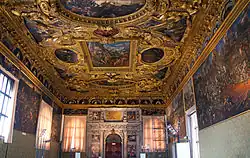 After it had been decided to repaint the palatine chapel whose decorations were in ruins,[68] it was Michele Steno who favored the completion of the decorative work in the hall.[67] The ceiling was made of coffers decorated with stars, possibly alluding to the doge's coat of arms.[69] Sanudo states that this work remained unfinished for a long time and was only completed in 1406.[70]