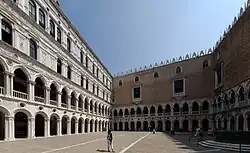 At the same time, a cage was also made under the portico of the Doge's Palace, suitable for housing a pair of lions, which gave as offspring three cubs, one male and two females, one of which was sent to Verona as a gift to Cangrande della Scala.[53] This cage proves the existence in the courtyard of a loggia on the ground floor of the western wing, erected under the dogate of Pietro Ziani. That loggia would disappear during the works carried out in that wing starting in 1424.[55]