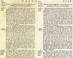 Needing an editor, the two chose a 28-year-old scholar named William Smellie who was offered 200 pounds sterling to produce the encyclopedia in 100 parts (called "numbers" and equivalent to thick pamphlets), which were later bound into three volumes. The first number appeared on 10 December 1768 in Edinburgh, priced sixpence or 8 pence on finer paper.[3] The Britannica was published under the pseudonym "A Society of Gentlemen in Scotland", possibly referring to the many gentlemen who had bought subscriptions.[4] By releasing the numbers in weekly instalments, the Britannica was completed in 1771, having 2,391 pages. The numbers were bound in three equally sized volumes covering A–B, C–L, and M–Z; an estimated 3,000 sets were eventually sold, priced at 12 pounds sterling apiece.[5] The first edition also featured 160 copperplate illustrations engraved by Bell. Three of the engravings in the section on midwifery, depicting childbirth in clinical detail, were sufficiently shocking to prompt some readers to tear those engravings out of the volume.[4]