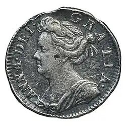Anne's reign produced silver pennies in 1703, 1705, 1706, 1708, 1709, 1710, and 1713. The obverse of the coins show her left-facing bust with the inscription ANNA DEI GRATIA, while the reverse shows the crowned "I" and (1703) MAG BR FRA ET HIB REG 1703, (1705,6) MAG BR FR ET HIB REG, or (1708–13) MAG BRI FR ET HIB REG.