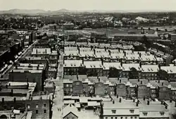 A mass exodus of Quebec workers began after the Civil War with most in higher density textile manufacturing towns, such as Holyoke, as well as Gardner, Lowell, and Fall River.[11] As the French-Canadians arrived in Holyoke in the 1880s, unlike many industrial cities with one or two large employers or institutions, their arrival coincided with the construction of dozens of mills in multiple industries. In less than 30 years the city population tripled in size to 35,000 residents, and with this social structures saw dramatic change.[11][19][20] Indeed the influx of Canadian French in Holyoke was attributed to the city having an average of 12 residents per household in 1885, twice the Massachusetts average.[21] During this period, much of The Flats (Wards 1 and 2) became known as "Frenchville."[22]