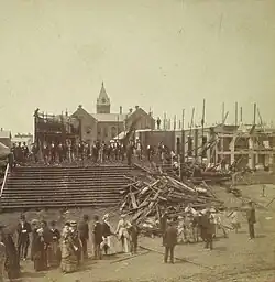 As previously mentioned, the Precious Blood church would become known infamously worldwide for the fire which destroyed its original meetinghouse during the eponymous Precious Blood Church fire of May 27, 1875.[81][82] The day after the fire, the Holyoke Transcript would publish its first and only edition in French.[14] The paper was however not the first Holyoke serial to publish in French. In 1874, Dr. M. M. Mitivier, who was also among the first French to sit on the city council, began publishing the Courrier de Holyoke. The first regular French newspaper in Holyoke, the paper's existence was brief, ceasing publication after 4 months.[14][83] Another short-lived paper, Le Ralliement, was established by Gabriel Marchand, son of Quebec Premier Félix-Gabriel Marchand, in 1886, publishing weekly until about 1888.[84][85]