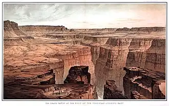 More than a decade after the Ives Expedition and with help from the Smithsonian Institution, Powell led the first of the Powell Expeditions to explore the region and document its scientific offerings.[19] On May 24, 1869, the group of nine men set out from Green River Station in Wyoming down the Colorado River and through the Grand Canyon.[13] This first expedition was poorly funded and consequently no photographer or graphic artist was included. While in the Canyon of Lodore one of the group's four boats capsized, spilling most of their food and much of their scientific equipment into the river. This shortened the expedition to one hundred days. On August 27, 1869, the men, wet, hungry, and dealing with contention among the trip members, came upon a rapid worse than any they had yet seen. The group didn’t know if hiking out or traveling on by boat was the appropriate action. The next day they split amicably into two groups with William Dunn, Oramel and Seneca Howland heading on foot up a side canyon now called Separation Canyon. The three men were never seen again while Powell and the others stayed on the river and exited Grand Canyon two days later.[32] Some historians have speculated the three were killed by the Shivwits Band of Paiutes, the Hualapai, or by Mormons in the town of Toquerville.[33][34][35][36][37]