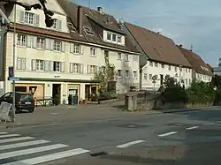 The settlement of the Jews in Laupheim developed on the so-called Judenberg ("Jews’ mountain" or rather "Jews’ hill") with the Judengasse ("Jews’ Lane") at its centre, a ghetto-like area, separated from the rest of the town, yet in close proximity to the market square. The Judenberg forms a regular square where the 8 oldest houses, arranged in 3 rows, are positioned parallel to one of the main streets leading away from the town centre.[10] The local Jews were allowed to influence the planning and design of their houses from the end of the 18th century onwards. It is remarkable, even today, that all houses are approachable from the front as well as the back, and that even the front yards and front gardens are not fenced in. The reason for this lies in the fact that the Judengasse was meant to incorporate the whole Jewish settlement to form an eruv.[19]