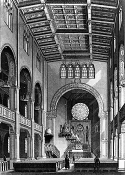 The beginning of the 19th century marked a revival of the Leipzig Jewish community. Starting in 1810, Polish Jews who came to Leipzig to trade were allowed to stay.[4] From there, the Jewish community expanded. Jews were once again allowed to hold public prayer services, and in 1815 the municipal council agreed to open Leipzig's first Jewish cemetery.[4] On May 18, 1837, Leipzig's growing Jewish community received permission to form a religious community, though their request for permission to build a synagogue was not granted.[8] On August 16, 1838, they were granted civil rights, with the exception of municipal and political rights.[2] During this time, Jews began to take a more active role in Leipzig's academics. In 1839, Julius Fuerst became the first Jew to lecture at the University of Leipzig.[4] Leipzig Jews even served in prominent judicial positions during this time, like Martin Eduard Sigismund von Simson, who served as the president of the law courts in Leipzig from 1879 until 1891.[4] However, it was nearly impossible for Ostenjuden, foreign Jews, to obtain Saxon citizenship. In order to do so, Ostenjuden had to be born in Leipzig and 21 years of age, or a resident of Saxony for at least thirty years.[12] The Jewish community as an officially state-recognized organisation was established only in 1847 and only by then were Jews allowed to settle in Leipzig without any restrictions.[4] Reform movements of the mid-19th century eventually led to the construction of the Leipzig Synagogue in the Gottschedstrasse in 1855, nearly two decades after Rabbi Zechariah Frankel attempted to found a Synagogue in Leipzig in 1837 and was rejected.[4] The first Rabbi to serve the Jewish community in Leipzig was Rabbi Dr. Adolph Jellinek, who served from 1848 to 1855 and set the precedent of the Chief Rabbi's role in uniting the Jewish community of Leipzig.[4] Towards the end of the 19th century, Antisemitism began to intensify. Several Antisemitic newspapers began to appear around this time, and the frequency of targeted harassment and discrimination against Jews increased.[9]