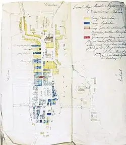 At the beginning of the 19th century, this law was violated. Jews settled in several houses near the Great Market. This caused protests from the Catholic residents, who demanded the return to the previous state.[23] The judge of the Peace Court, Filip Piegłowski, appointed by the city owner, referred to the 1788 privilege and ordered the removal of Jews from the Market. This took place on 19 July 1820.[24] It was at this time that, at the initiative of Catholic townspeople, Szymon Badowski created a city plan, marking public utility buildings (including those belonging to the Jewish community) and also the boundary established by Mikołaj Radziwiłł's privilege.[24]