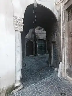 The Jewish cemetery was located in the resort community of Magnano, three kilometers downstream from the city center along the Via Tiburtina. In a later period the archives indicate the cemetery at Rocca Pia's castle. According to the sources the synagogue was located in the area between the existing street of Via Palatine and the Vicolo dei Granai, the latter known as " alley of the Jews." The building, built over the centuries in various buildings, was finally destroyed in 1937 to expand via Palatina. The Jewish ghetto was surrounded by a two-door under the arch of the medieval portico, at the beginning of the alley that brings to Piazza Palatina, and the other at the end of the Vicolo dei Granai that ends in Via Palatina.