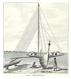 The Marshallese sailed between islands on proas made from breadfruit-tree wood and coconut-fiber rope.[8] They navigated by using the stars for orientation and initial course setting, but also developed a unique piloting technique of reading disruptions in ocean swells to determine the location of low coral atolls below the horizon.[9] The Marshallese recognized four different types of swells coming from the cardinal directions, and noticed that swells refracted around the undersea slope of atolls. When refracted swells from different directions met, they created noticeable disruption patterns, which Marshallese pilots could read to determine the direction of an island.[10] When interviewed by anthropologists, some Marshallese sailors noted that they piloted their canoes by both sight and feeling changes in the motion of the boat.[7] The Marshallese preferred to sail between July and October, because Pacific trade winds made the swells harder to read during the rest of the year.[11] Sailors also invented stick charts to map the swell patterns, but unlike western navigational charts, the Marshallese stick charts were tools for teaching students and for consultation before embarking on a voyage; navigators did not take charts with them when they set sail.[12] The Marshallese made three types of charts: mattang charts, which were instructional tools for teaching the principles of piloting, and meddo and rebbelib charts, which represented the relative positions of actual swells and islands.[7]