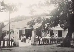 Japanese, Koreans, and Okinawans settled in the Marshall Islands, although they formed one of the smallest settler communities in the South Seas Mandate. In 1937, the immigrant population of the Marshalls was approximately 500, while Palau had 11,000, and Truk and Ponape had 3,600 each.[182] Marshall Islanders remained the majority of the population throughout the mandate period, unlike Palau and the Mariana Islands, where Japanese settlers became the majority.[183] While cities significantly grew and developed in other parts of the Japanese mandate, the administrative center at Jabor, Jaluit, grew more modestly during the Japanese period. The town included port infrastructure, government offices, NBK offices and warehouses, a post office, a public school, a communications post, a hospital, a power plant, and a settlement of Okinawan fishermen, but lacked many of the commercial businesses and social establishments built in areas with larger immigrant populations.[184] While the immigrant labor force was small, their presence drove wages in the Marshall Islands down to pre-German colonial levels.[155]