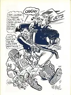 The Jets' success in signing Namath and the rise of the team in the standings adversely affected their crosstown rivals, the Giants, who had played in five NFL championship games in six years to 1963, but who thereafter declined in the standings. Giants owner Wellington Mara stated, "I think the Jets coming in when they did contributed to our bad years, because we tried to do everything for the short term rather than the long haul—we'd trade a draft choice for a player, figuring he'd give us one or two good years. We didn't want to accept how the public might react if we had a bad year or two or three."[73] In 1967, the Giants traded for star Minnesota Vikings quarterback Fran Tarkenton in the vain hopes he would lead them to renewed success and rival Namath in the public eye.[74] In August 1969, the Jets faced the Giants in a preseason game at the Yale Bowl.[75] While the Jets' Super Bowl win legitimized the AFL as a comparable league to the NFL in the eyes of many, others doubted the AFL's standard of play, and the Jets were underdogs going into the game.[76] Giants coach Allie Sherman approached the game as if it were a regular season contest, and the Jets sent the three remaining original Titans out for the coin toss.[75] The Jets defeated the Giants 37–14,[70] and Sherman was fired a few weeks later. The Jets' fellow tenants, the Mets, won a championship themselves; the baseball team's accomplishments forced the Jets to play their first five games on the road.[75] The Jets recovered from a slow start to win their second consecutive Eastern Division championship, but fell to Kansas City in the divisional round of the playoffs, 13–6.[70]