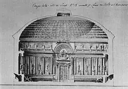 During 1766–1785 on the basis of Jakub Fontana's plans,[3] the southern wing of the castle, which was burnt on 15 December 1767 was rebuilt (2 destroyed floors, a new elevation on the south side with three rysalits, the division of the façade by lizens and Jon capital pilasters).[6] Between 1774 and 1777 the monarch's private apartments were furnished.[6] They consisted of the Prospect Room (with landscapes by Canaletto), the chapel, the Audience Chamber, and the Bedchamber, while between 1779 and 1786 the Senate Apartments were completed, consisting of the Ballroom, the Knights Hall, the Throne Room, the Marble Room, and the Conference Chamber.[4] These rooms contained pictures and sculptures depicting great events in Poland's history, as well as portraits of Polish kings, generals, statesmen and scholars (including Copernicus and Adam Naruszewicz).[3] The Castle also housed the rich royal collections including 3200 pictures, classical statues, about 100 000 graphics, in addition to medals, coins, and a fine library, to house which a separate building was erected in 1780–1784.[11] The new library building housed many books, gems, drawings, coins, maps and plans belonging to the monarch. The Royal Library's book collection amounted to 16 000 volumes of various works, 25,525 drawings, 44,842 etchings in 726 bound volumes, overall a number of 70,000 etchings—fancy dress balls were also held in this hall.[11]