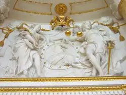 The next reconstruction project of the Royal Castle appeared after Augustus III took to the Polish throne in 1733. New plans, which were formed in 1734 and developed in 1737 by architect Gaetano Chiaveri, saw among other things, the reconstruction of the castle's façade on the Vistula side in the rococo style, which was meant to form a new so called Saxon elevation and also the conversion of the north-east part with the Altana Tower, where it was planned for 3 two-storey rysalits to be built on.[6][10] The reconstruction work according to these plans was carried out with various intensity between 1740 and 1752. During the period of 1740-1747 the façade on the Vistula side was reconstructed in the late baroque style (architects: Gaetano Chiaveri, Carl Friedrich Pöppelmann, Jan Krzysztof Knöffel).[10] One of the best sculptors who did work on the castle in this period was Jan Jerzy Plersch, who made the royal decorative frames, mouldings and statues called the Famous Figures, which held the royal crowns on the top of the middle rysalit, of the Saxon elevation, on the Vistula side. The last reconstruction work of this period was finished by late 1763, after the death of Augustus III, when Plersch made the last sculptures and frames with province emblems for the Parliament Hall.[10]