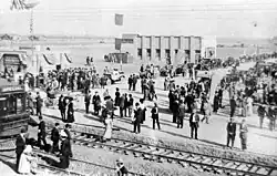 Real estate development once again boomed. In the "biggest land transaction ever recorded in Los Angeles County",[53] a syndicate led by Harry Chandler, business manager of the Los Angeles Times, with Hobart Johnstone Whitley, Isaac Van Nuys, and James Boon Lankershim acquired "Tract 1000", the remaining 47,500 acres (192 km2) of the southern half of the former Mission lands—everything west of the Lankershim town limits and south of the old furrow excepting the Rancho Encino. As the Los Angeles Suburban Homes company, they laid out plans for the towns of Van Nuys, Marion (now Reseda) and Owensmouth (now Canoga Park, West Hills, and Winnetka), a system of highways, and eventual incorporation into the city of Los Angeles. In the "Sale of the Century" in November 1910 they sold the remaining livestock and non-land assets of the Lankershim Farming and Milling Company at auction. The Los Angeles Times called the auction "the beginning of a new empire and a new era in the Southland".[53][54]