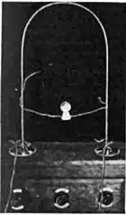 Tesla employed the Tesla coil in his efforts to achieve wireless power transmission,[36] his lifelong dream. In the period 1891 to 1900 he used it to perform some of the first experiments in wireless power,[37][38][39] transmitting radio frequency power across short distances by inductive coupling between coils of wire.[38][39][40] In his early 1890s demonstrations such as those before the American Institute of Electrical Engineers[40] and at the 1893 Columbian Exposition in Chicago he lit light bulbs from across a room.[39] He found he could increase the distance by using a receiving LC circuit tuned to resonance with the Tesla coil's LC circuit,[13] transferring energy by resonant inductive coupling.[39] At his Colorado Springs laboratory during 1899–1900, by using voltages of the order of 10 million volts generated by his enormous magnifying transmitter coil (described below), he was able to light three incandescent lamps at a distance of about 100 feet (30 m).[34][41][42] Today the resonant inductive coupling discovered by Tesla is a familiar concept in electronics, widely used in IF transformers and short range wireless power transmission systems[39][43] such as cellphone charging pads.