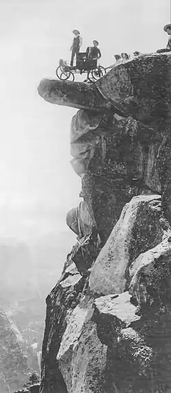 In 1900, Oliver Lippincott became the first to drive an automobile into Yosemite Valley.[49] Yosemite Valley Railroad, nicknamed "the short line to paradise," arrived at nearby El Portal, California in 1907.[50] Numerous hiking and horse trails were cleared, including a walking path through Mariposa Grove.