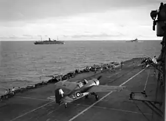 An important development of the early 1950s was the introduction by the Royal Navy of the angled flight deck by Capt D.R.F. Campbell RN in conjunction with Lewis Boddington of the Royal Aircraft Establishment at Farnborough.[28] The runway was canted at an angle of a few degrees from the longitudinal axis of the ship. If an aircraft missed the arrestor cables (referred to as a "bolter"), the pilot only needed to increase engine power to maximum to get airborne again, and would not hit the parked aircraft because the angled deck pointed out over the sea.