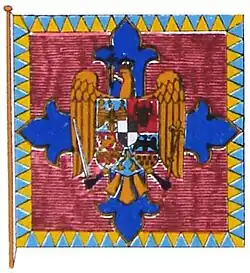 The resulting designs, distributed on 1 September 1863, differ somewhat from those legislated in March. This, the Roman eagle, wings outstretched, wearing the princely crown, carries the princely scepter in its right talon and the sword in its left; on its breast appears an open shield topped by the princely crown. On the left of the shield, over azure and gold, is the Wallachian eagle (a cross in its beak, in left profile and wearing the princely crown); on the right, over red and azure, is the Moldavian aurochs with a star between its horns. Hanging from the scepter and sword is a red ribbon with gold-embossed letters: "HONOR ET PATRIA" ("honor and Fatherland").[45] In the fly corners the princely cipher is stitched, surrounded by a laurel wreath; all are golden. Each flag also had inscribed in gold the name of the unit that bore it.[46] The cloth part was 122 centimeter long and 100 centimeter wide.[47] A metal Roman eagle was affixed to the tip of the flagpole.[48] Although the order of 19 March had the Moldavian symbol in the right, nevertheless the first on the shield is the Wallachian eagle. The design was most likely adopted due to customary usage that arose after Bucharest became the single capital in February 1862.[49]