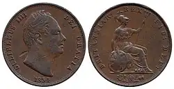 The halfpenny of King William IV (1830–1837), produced in 1831, 1834, and 1837, continues the George IV design but with a right-facing bust of the new king, with the inscription GULIELMUS IIII DEI GRATIA date, while the reverse is identical to the previous reigns'.
