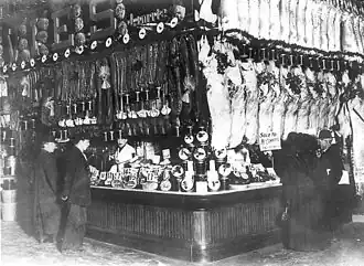 Another development facilitating the invention and popularization of the proto-hamburger was the increased production of beef through livestock intensification. By the late 19th century, an increasing amount of land was being devoted to cattle and a growing number of people being employed as cowboys, resulting in the United States becoming one of the world's largest producers and consumers of beef.[38] The 1880s were declared "The Golden Age of Beef", during which the abundance of rural beef production made vital its transportation by rail from agricultural to urban areas. This gave rise to various methods of meat preservation for making possible the consumption of fresh meat in urban and industrialized areas, among the refrigerator cars and different methods of packaging meat (such as corned beef), which were promoted by industrialists like Gustavus Swift (1839–1903). Around this time, the city of Chicago, along with cities on the East Coast, became a focal point for the large-scale processing of beef. Beef was already inexpensive at that time, and it was available to the working class. This put the Hamburg steak within reach of the vast majority of the population, giving rise to what some authors jokingly call the "American beef dream".[24] In this era, the number of steakhouses that specialized in serving steaks increased markedly; some restaurants even served steak along with seafood, in a dish known as Surf and turf.