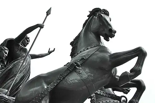 By the time of Julius Caesar's attempted invasion of Britain in 55 BC, the inhabitants of Britain included proficient horsemen. Caesar's forces were met by British horsemen and war chariots, the chariots outfighting the Gaulish horsemen who had accompanied him.[30] Caesar later faced organised resistance led by Cassivellaunus, with over 4,000 war chariots.[31] To the east of the Pennines, the Romans also encountered the Gabrantovici, or "horse-riding warriors".[32] The spread and development of horse trappings recovered from this period, such as bits, strap junctions and terrets, have been used to indicate the withdrawal of ruling groups of Britons during the Roman conquest of Britain.[33]