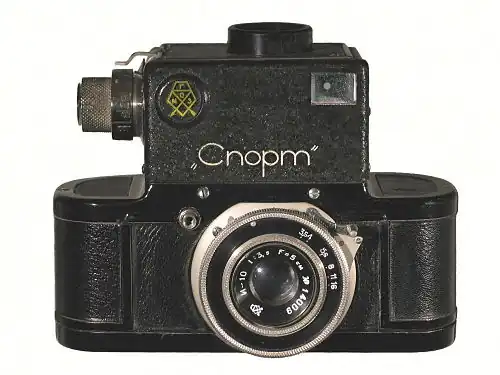 The first 35mm prototype SLR was the "Filmanka" developed in 1931 by A. Min in the Soviet Union.[5] In 1933 A.O. Gelgar developed the "GelVeta" also in the USSR, later renamed Спорт ("Sport").[6] "Sport" was a very smart design with a 24mm × 36mm frame size, but, according to some sources, it did not enter the market until 1937,[7] although there is now some evidence emerging that "Sport" may have been in limited production before 1936. Because of the probable production in small numbers it has been claimed not to be the first mass-produced 35mm SLR.