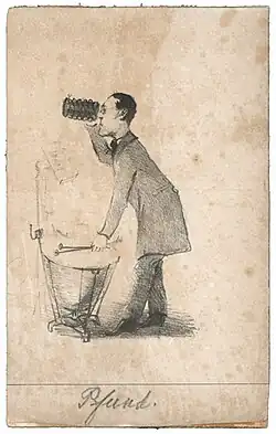 These drums came about as a result of several modifications that were made to the Einbigler drums. The changes were suggested by timpani virtuoso of the time Ernst Gotthold Pfundt, as well as Carl Hoffmann and Friedrich Hentschel. The changes they made to the drum included a much larger fork-shaped support for the kettle which was attached the very rim of the kettle as well using heavier iron for the assembly of the drum to provide much more support.[16] These drums also replaced the previously thin spider with a solid disk that was attached to the rocker arm under the drum by a very strong vertical axle. This stronger base and spider allowed for fine tunings to be done with much more ease. Timpani scholar Edmund Bowles summarizes the changes by saying, "Their contribution was a single, threaded crank acting upon a threaded lever that controlled the armature to which the tuning rods were attached. More significant was the fact that this simple device multiplied the force transmitted to the base plate by the tuning crank, making for a far more efficient and powerful mechanism."[17] These drums were also very highly regarded, as they received honorable mentions at both the Vienna World Fair in 1873 and the Dresden Trade Show in 1875.