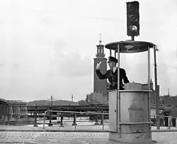 Before traffic lights, traffic police controlled the flow of traffic. A well-documented example is that on London Bridge in 1722.[3] Three men were given the task of directing traffic coming in and out of either London or Southwark. Each officer directed traffic coming out of Southwark into London, making sure all traffic stayed on the west side of the bridge. A second officer directed traffic on the east side of the bridge to control the flow of people leaving London and going into Southwark.